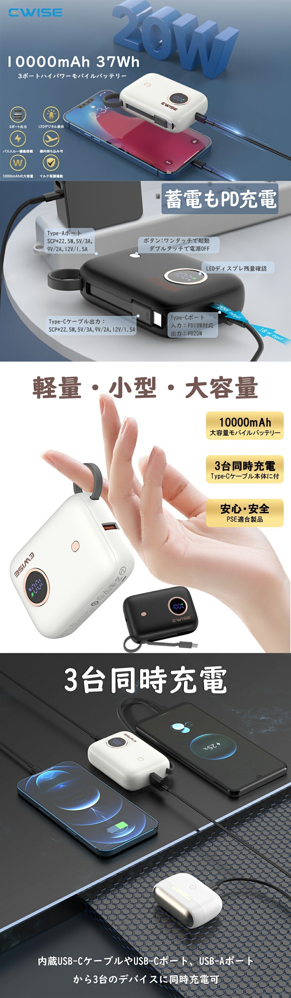 【 iPhone15対応 】 モバイルバッテリー 軽量 小型 10000mAh 急速充電 大容量 急速充電器 最大22.5W 3台同時 内蔵ケーブル スマホ充電器 QC3.0 PD 急速充電対応 バッテリー コンパクト軽量 携帯充電器 PSE認証済 災害グッズ