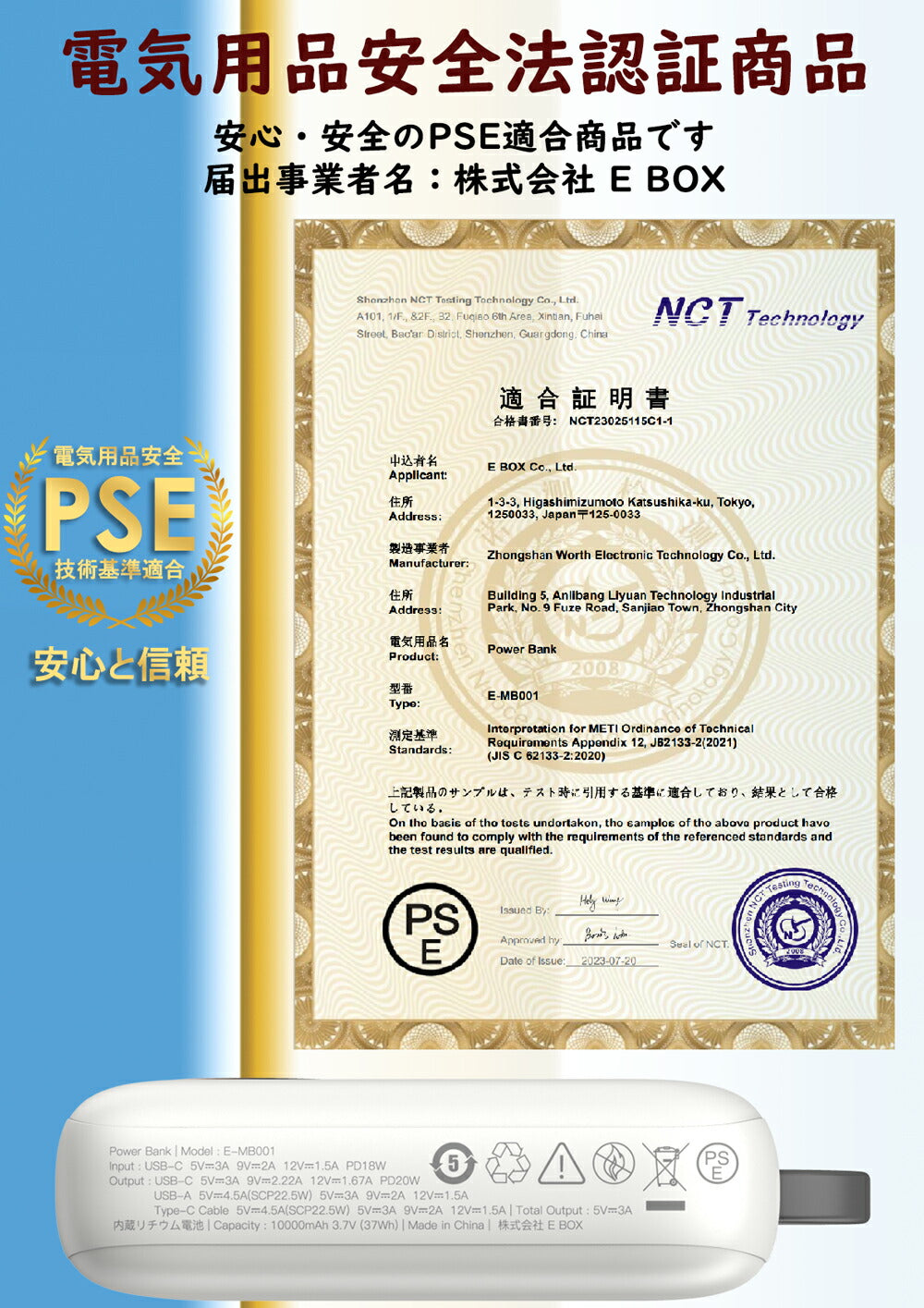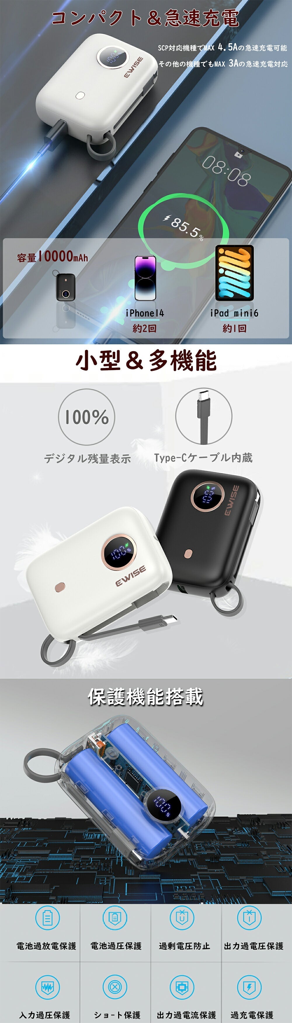 デジタル残量表示を、見やすい液晶画面でご利用可能な残量が確認できます。PSEマーク付きの電気用品で技術基準の適合性が確認され,過電圧、過電流、過熱、および回路のショートを防ぎ、急速かつ安全な充電を提供できます。