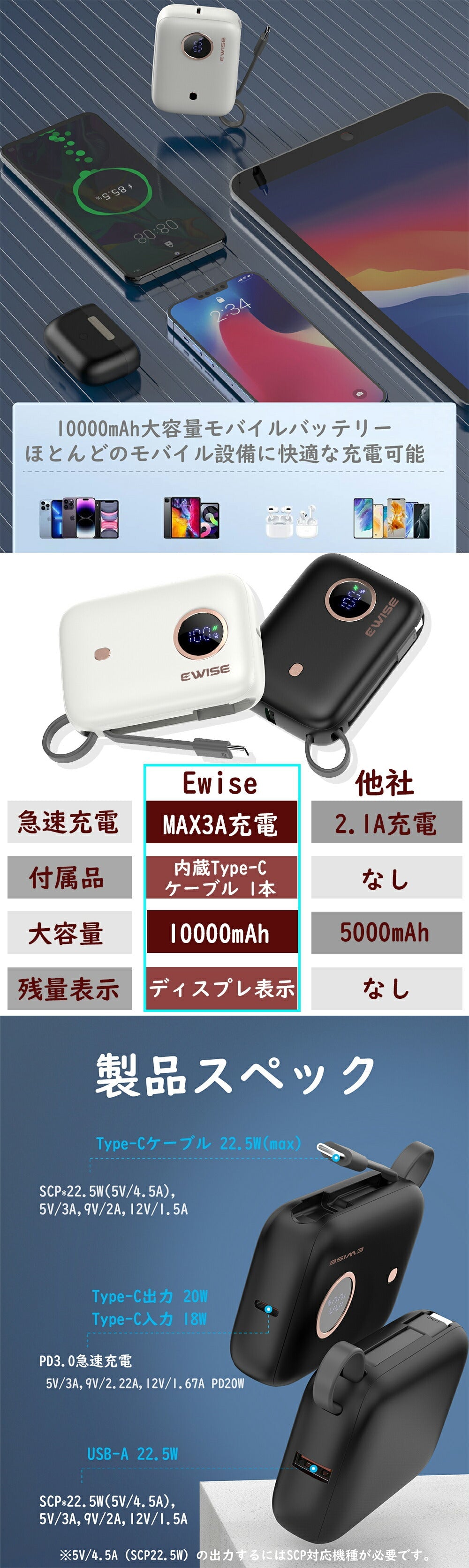 型番 PD 22.5W 急速充電 最大22.5Wの高出力を実現したPD モバイルバッテリーです。急速充電を対応、30分でiPhone 12を0%から50%まで充電することができます!最大3Aでフルスピード充電が可能、従来の5V=1Aと比べて30%充電時間を短縮できます。PD(USB Power Delivery)モバイルバッテリーとは急速充電のこと 10000mAh 大容量  USB-C+USBポート モバイルバッテリーの本体に2ポート搭載し、Typc-C + USB-Aポート搭載です。10000mAHの大容量モバイルバッテリーでiPhone 14に約2回、iPhone XS / Xに約3回、Galaxy S10に2回以上、iPad Pro... もっと読む