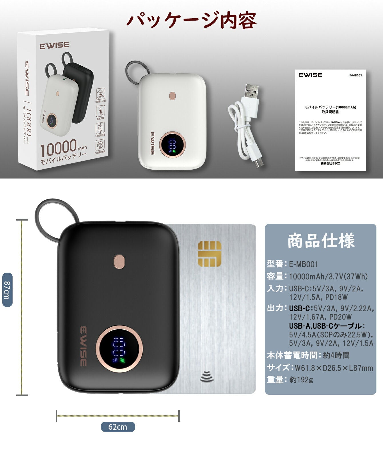 パッケージ内容モバイルバッテリー本体×1充電ケーブルUSB-A→USB-C×1取扱説明書保証書(本書)×1